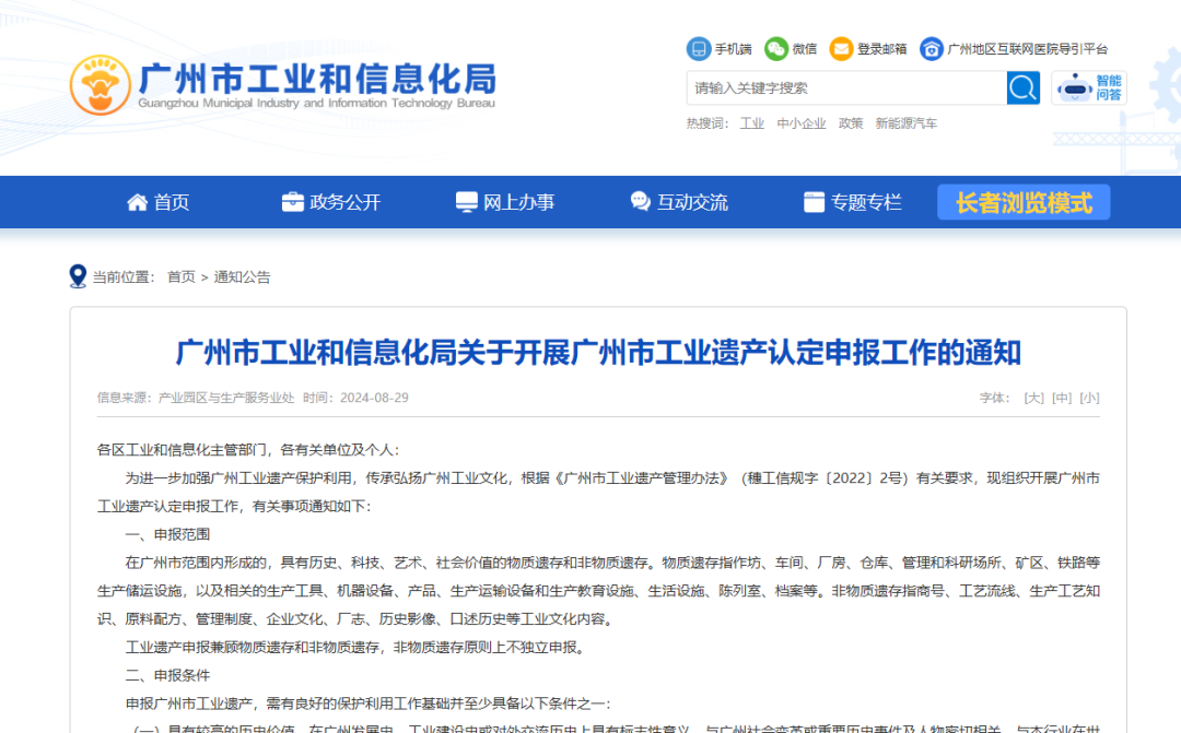 為進一步加強廣州工業遺產保護利用,傳承弘揚廣州工業文化,根據《廣州市工業遺產管理辦法》(穗工信規字〔2022〕2號)有關要求,現組織開展廣州市工業遺產認定申報工作,有關事項通知如下: