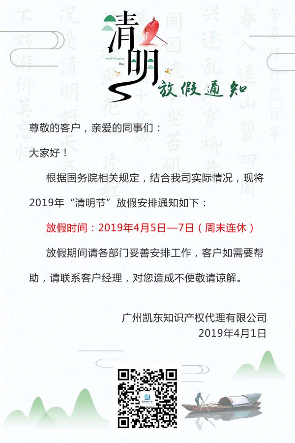 >>新聞資訊>>2019廣州凱東知識產權“清明節”放假安排通知