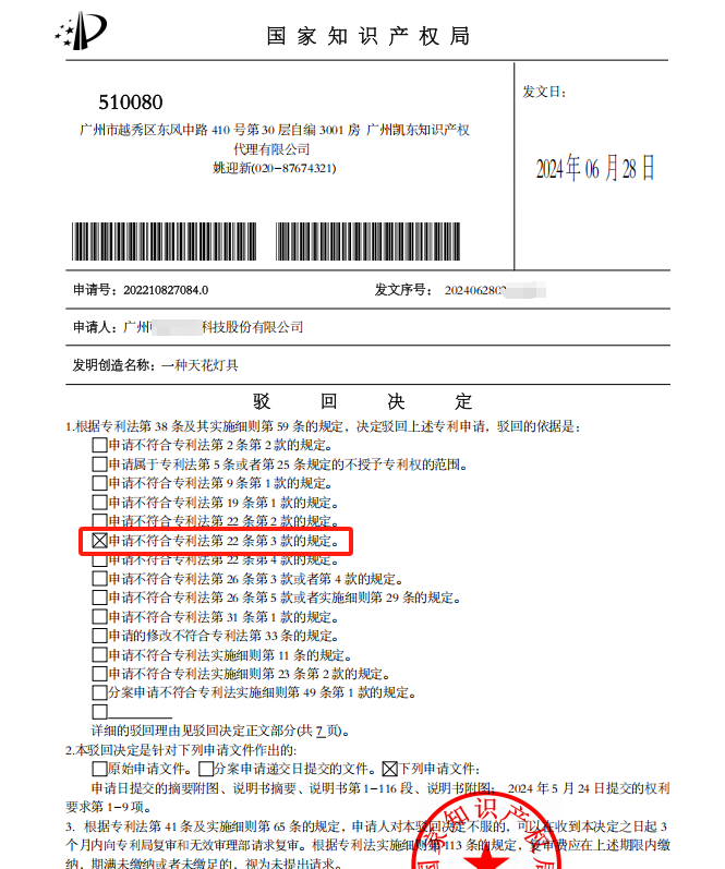 原審查結果:該公司2022年遞交的發明專利申請《一種天花燈具》,于2024年06月28日收到駁回決定,審查意見指出“申請不符合專利法第22條第3款關于創造性的規定,技術方案僅為常規照明部件的簡單組合,未體現突出的實質性特點與顯著進步”。