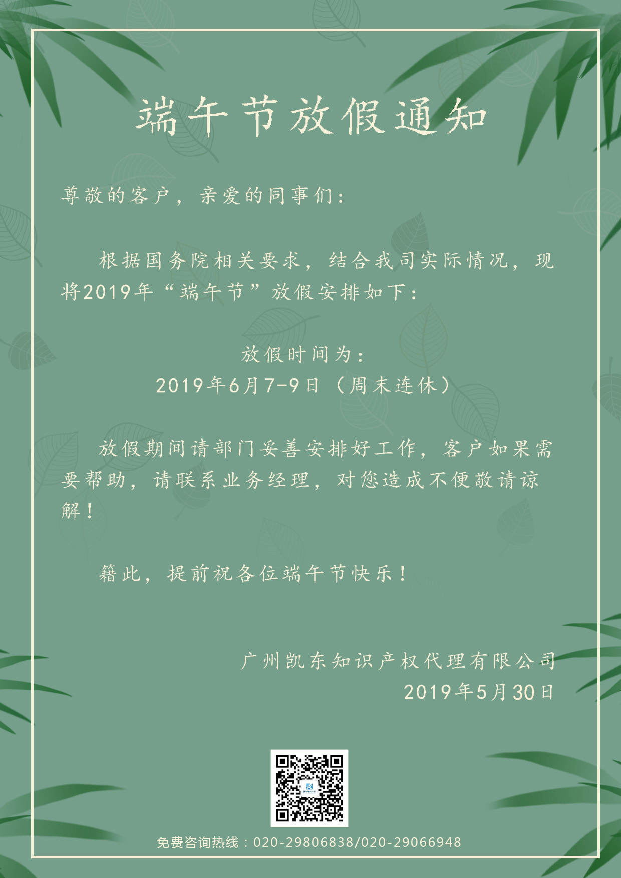 凱東知識產權關于2019年端午節的放假通知